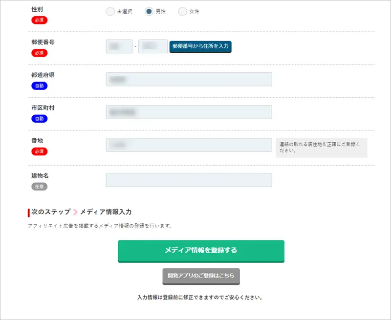 個人情報を入力したら、「メディア情報を登録する」をクリックして、ブログサイトの情報を入力します。