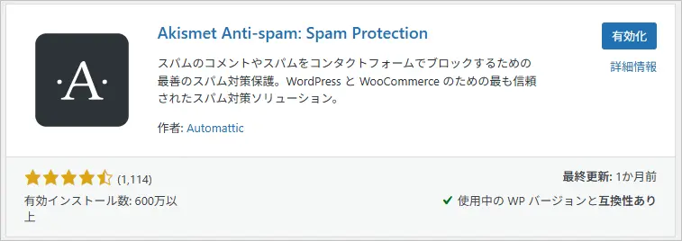 Akismet Anti-Spamは、スパムコメントを自動で選別してブロックするプラグインです。