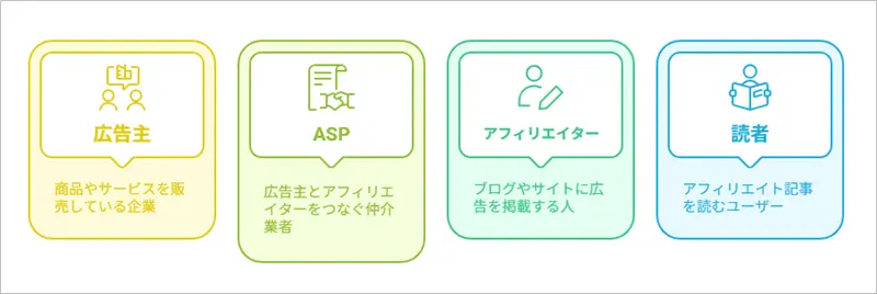 アフィリエイトの仕組みを理解するために、4つの関係者を押さえておきましょう。