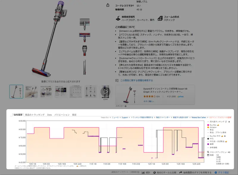 試しに、AmazonでDyson(ダイソン)のコードレス掃除機の商品ページを見てみると、下図のように過去の価格推移がグラフ表示で確認されていることが確認できます。