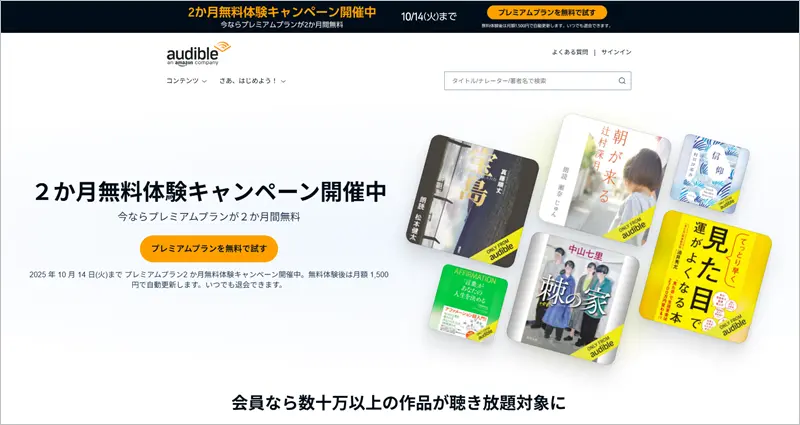 10月14日(火)までの期間、Amazonのオーディオブックサービス「Audible(オーディブル)」で、2か月間無料で利用できるキャンペーンを実施中。