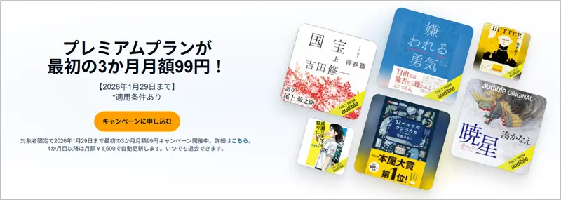 1月29日(木)まで、Amazonの聴く読書「Audibleプレミアプラン」に新規登録すると、3か月間、月額99円で聴き放題のキャンペーンを実施中です。