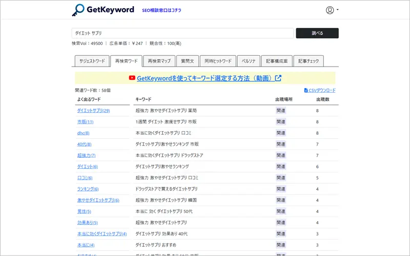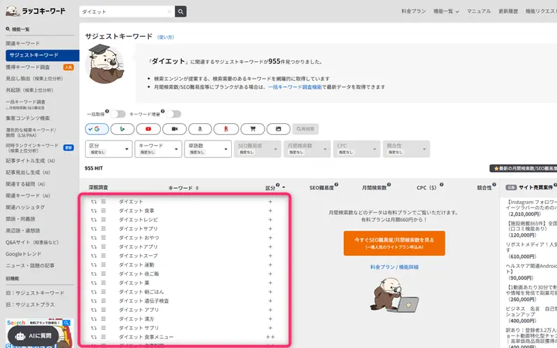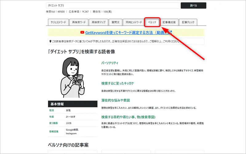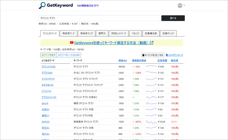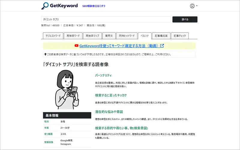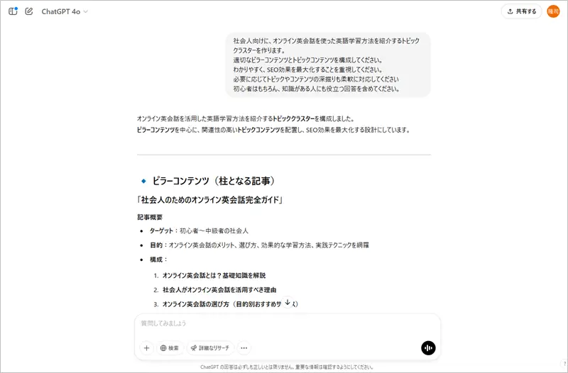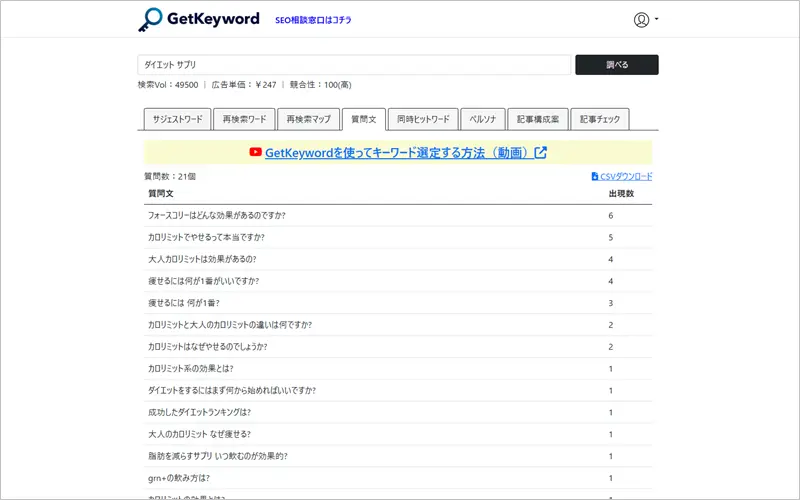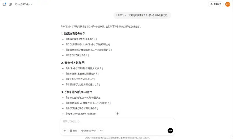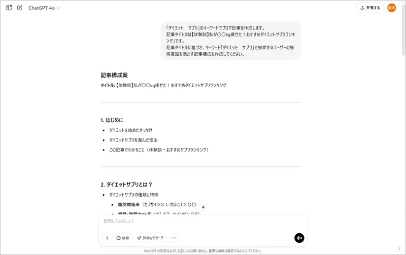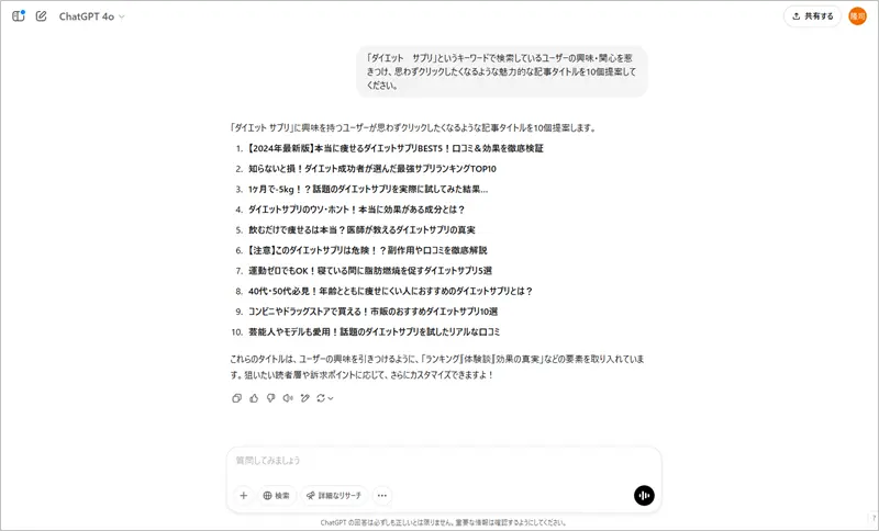 - キーワード選定:需要の多いキーワードやニッチなキーワードをAIが調べて提案してくれる