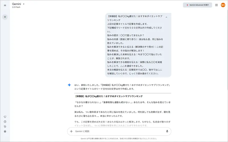 また、今まで記事を書いたことが無い人でも、AIを活用すれば、ライティング経験者が書いたような記事を数十秒で作れます。