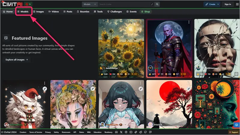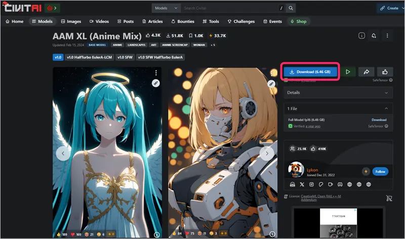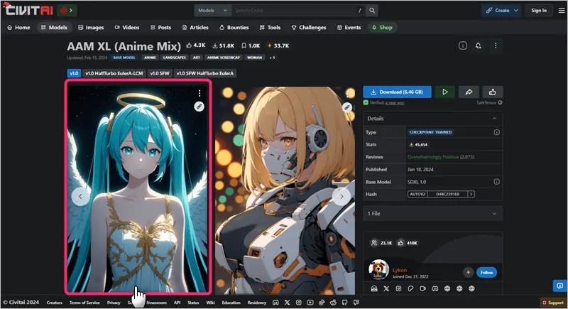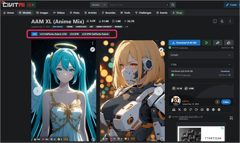 Checkpointをダウロードしたページに移動し、作成したいイメージ画像を選択します(本記事では左のイラストを選択)。