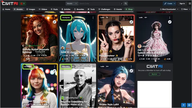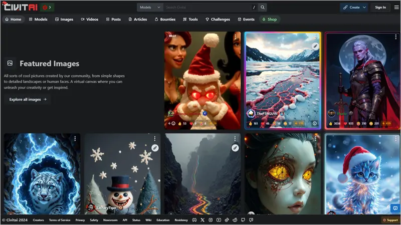 Civitaiは、Stable DiffusionのCheckpointの無料ダウンロード、投稿・共有ができるプラットフォームです。