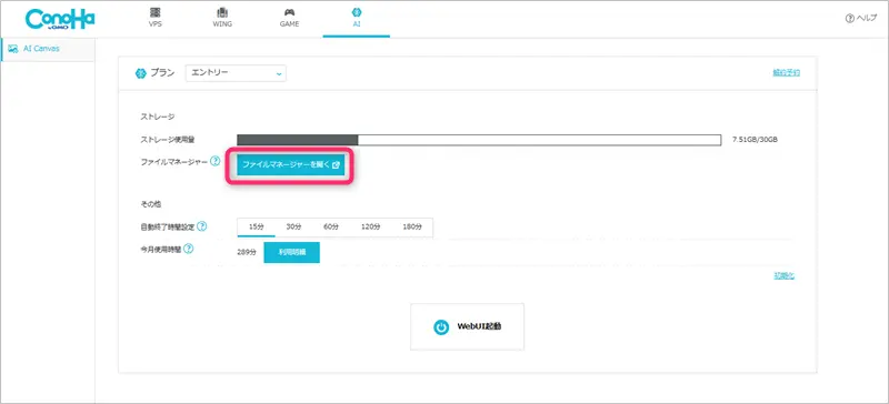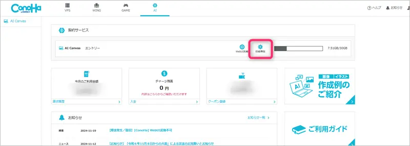 ConoHa AI Canvasのコントロールパネルを開き、「詳細情報」をクリックします。