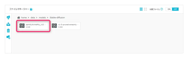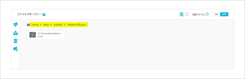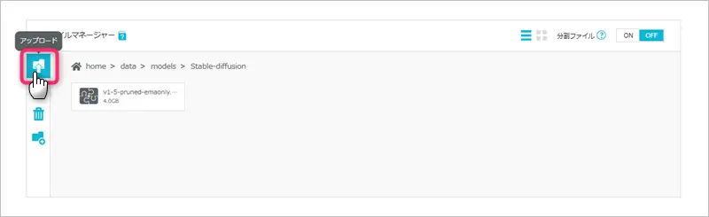 デフォルトのCheckpoint「v1-5-pruned-emaonly.…」があるフォルダまで進んだら、左側の「アップロード」アイコンをクリックします。