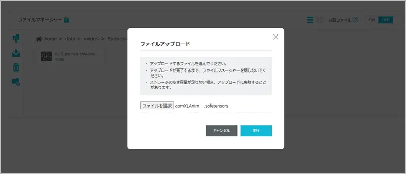 アップローダーが表示されますので、「ファイルを選択」から「○○.safetensors」を選択し、「実行」をクリックしてアップロードを行います。