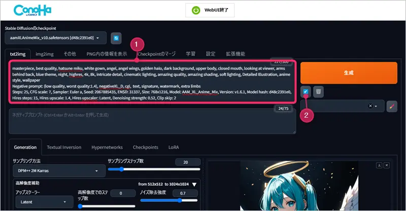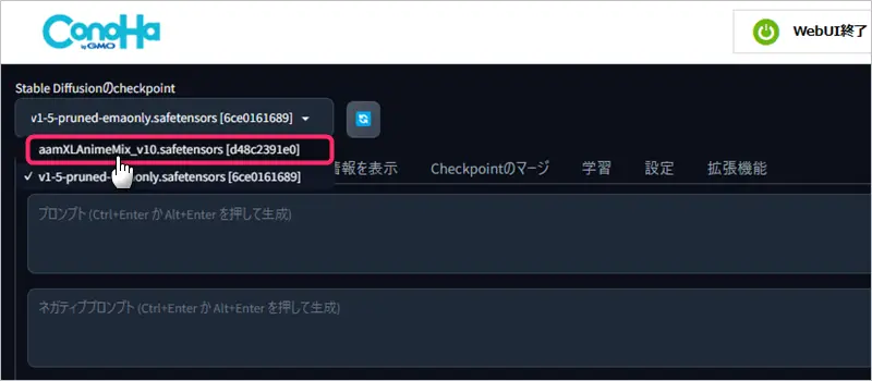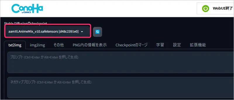 Conoha AI CanvasのStable Diffusion WebUIでモデルを使った画像生成したいです。