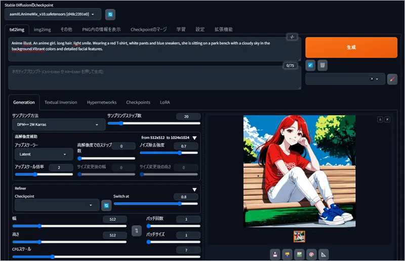 デフォルトのCheckpointを使用してイメージ通りの画像を作るのは難しいので、Checkpointのダウンロードサイトでイメージに近い画風のCheckpointを使用した方が確実ですし、イメージ通りの画像を作りやすいですよ。
