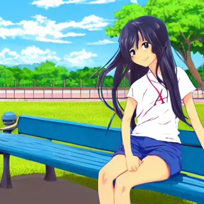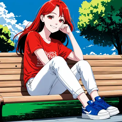 日本語訳:アニメのイラスト。アニメの女の子。明るい笑顔。赤いTシャツに白いパンツ、青いスニーカーを履いた彼女は、曇り空を背景に公園のベンチに座っている。鮮やかな色彩と細部にわたる顔の特徴。