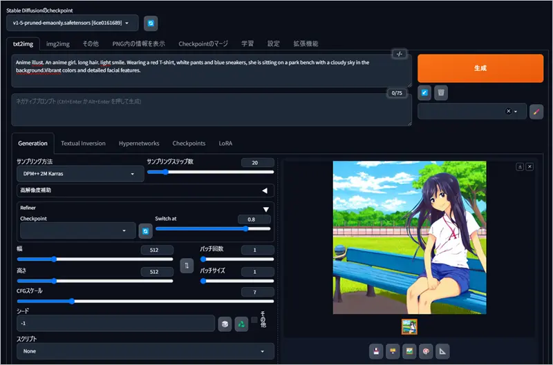 それでは、Checkpointを使った画像を生成してみたいと思います。