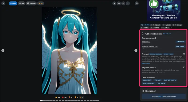 Checkpointの詳細ページに表示されている画像は全て、プロンプト/ネガティブプロンプト、設定が公開されています。