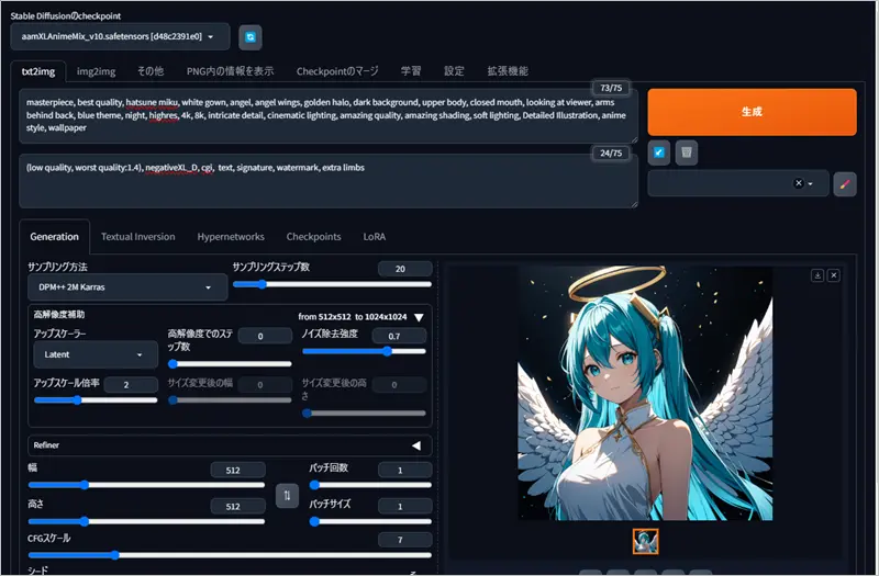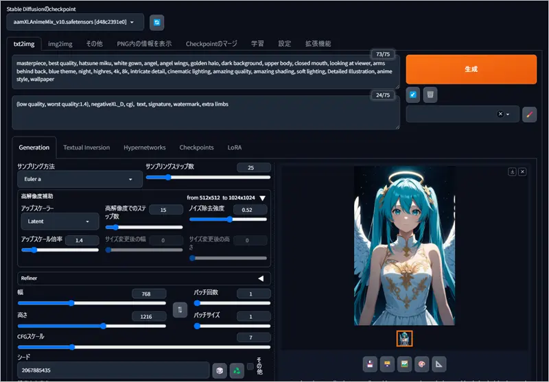 プロンプトやネガティブプロンプトに加えて、各設定が自動で割り当てられます。この状態で生成をクリックします。