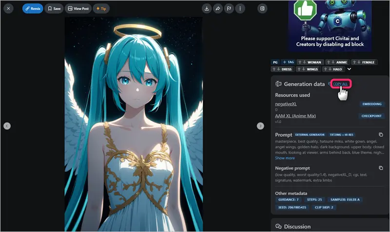 画像詳細ページの右にあるGeneration Dataの「COPY ALL」をクリックします。