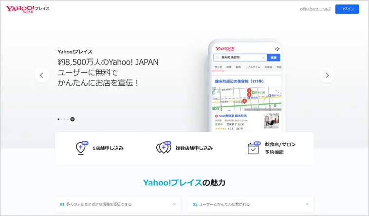 Yahoo!プレイスは、幅広い業種のビジネスが無料で登録できるサービスです。