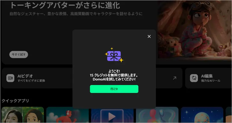 DomoAIは新規登録時に15クレジットが付与され、無料お試しができます。