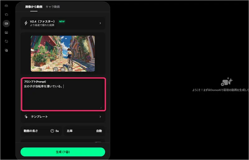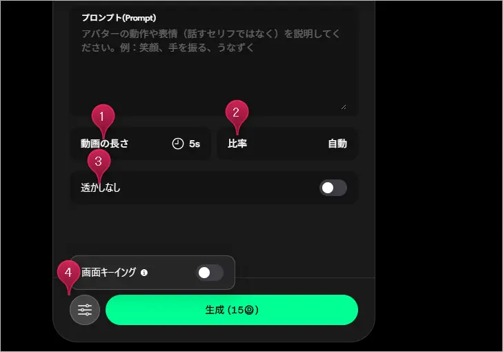 プロンプトを入力したら、このまま生成してもOKですが、動画の長さや比率、透かしの有無などの設定を変更できますので、生成ボタンを押す前に設定します。