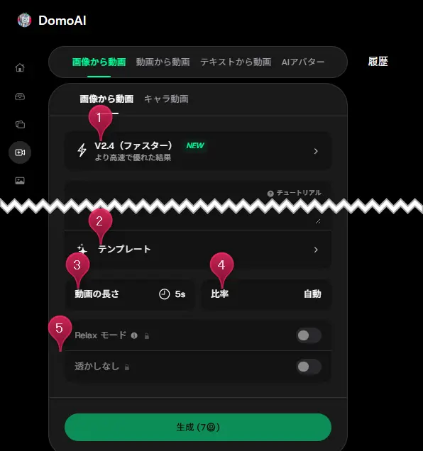 - Relaxモード:生成速度は大幅に落ちますが、その代わり、無制限で生成できます(スタンダード以上)。