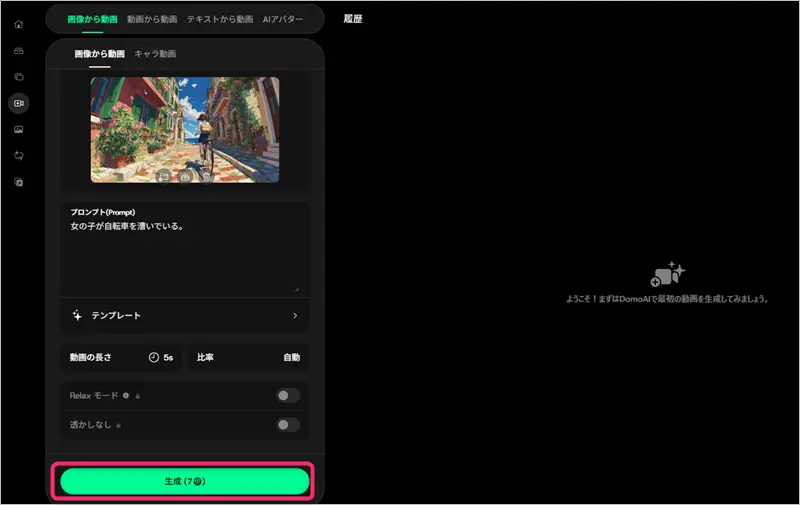 スタンダード以上のプランで利用可能な「Relaxモード(リラックスモード)」は、クレジットを消費せずに無制限で生成できます。