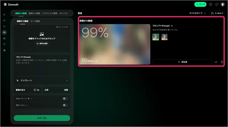 設定完了後、生成スタートをクリックすると動画生成がスタートします。