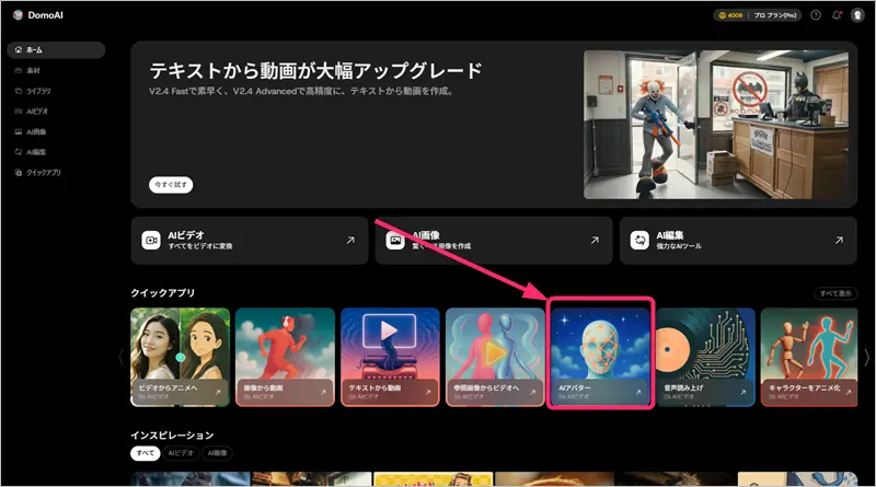 ダッシュボードのクイックアプリという項目にある「AIアバター」を選択します。