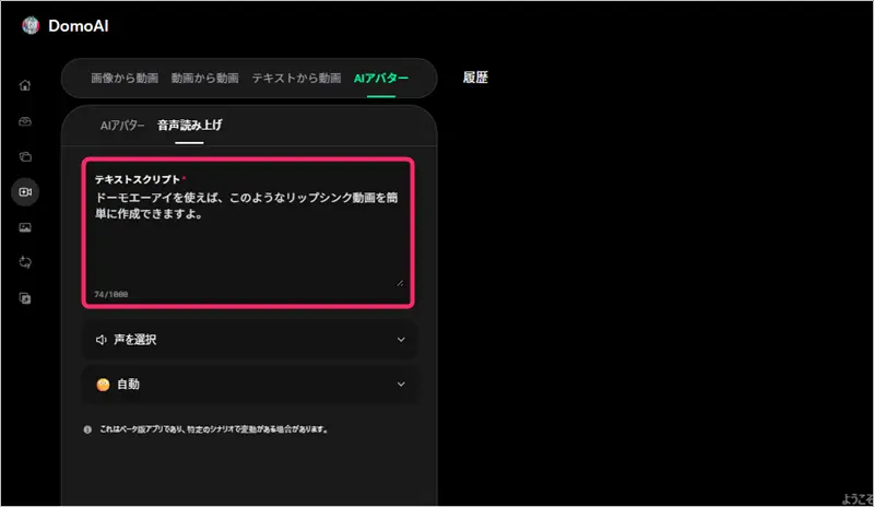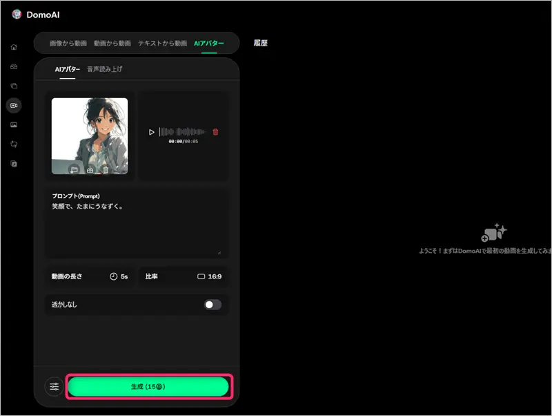 以上が「AIアバター」の基本的な使い方です。続いて、DomoAIで利用できるその他の生成機能(動画から動画変換やAI画像生成)についても簡単に紹介します。