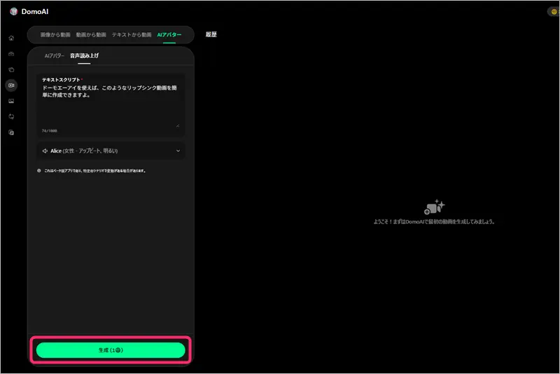 声を選択したら、「生成(1クレジット)」をクリックします。