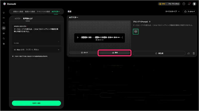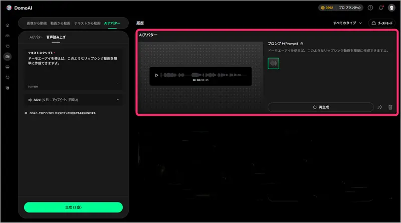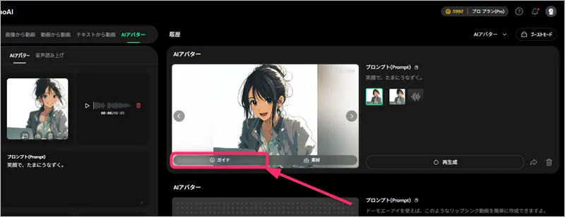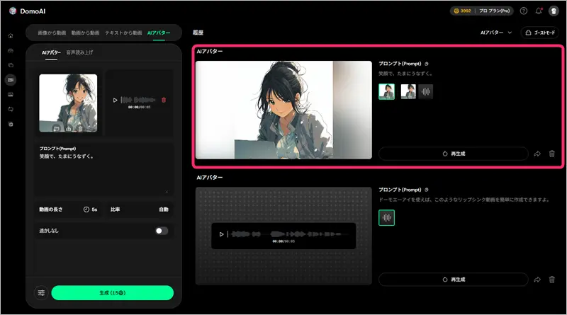 以上が画像から動画を生成する使い方です。続いて、画像に声を組み合わせて口パクや表情を自動生成できる、AIアバターを喋らせるやり方を解説していきます。