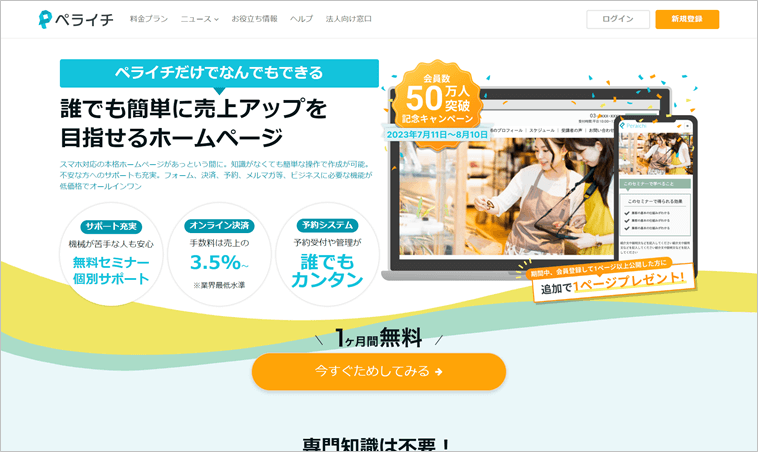 ペライチは、1ページのWebサイトを直観的な操作で作れるランディングページ作成ツールです。累計50万人以上のユーザーが利用しています。
