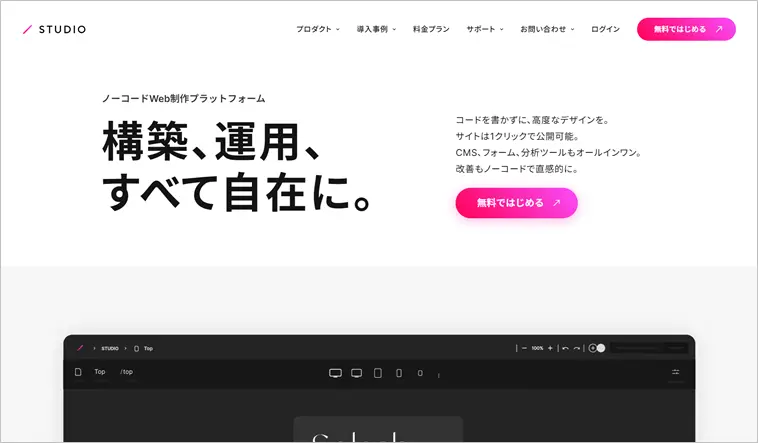 STUDIO(スタジオ)は、ノーコードで美しいデザインのWebサイトが作れるWebサイト作成ツールです。1カラムのテンプレートを使ってランディングページが作れます。