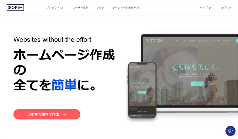 ジンドゥーは、170万以上のユーザーが利用している、国内最大級のWebサイト作成ツールです。テンプレート数も多く、直感的な操作でページを作れます。