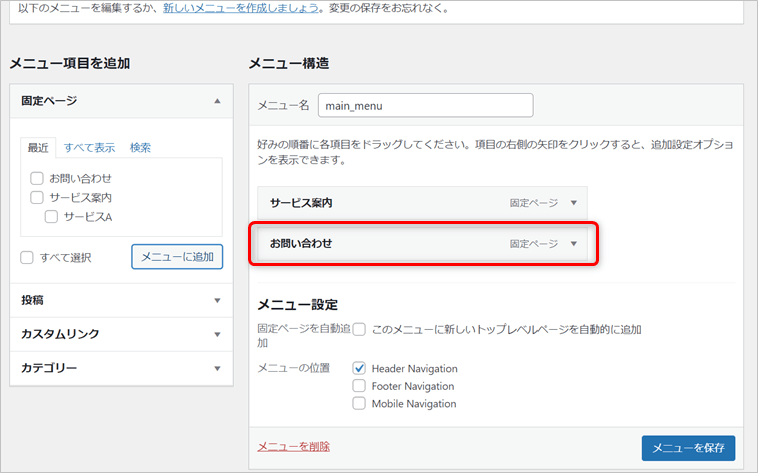 メニューの作り方は別記事の「ナビゲーションメニューの作り方【メニュー追加・階層】」をどうぞ。