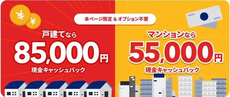 • 戸建て:最大85,000円 / 集合住宅:最大55,000円のキャッシュバック特典