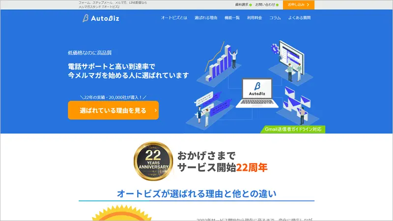 オートビズは、20,000社以上の導入実績を誇る、リーズナブルな価格で高い到達率を実現するメール配信システムです。初心者でも手軽に扱えるよう、ユーザーインターフェイスはシンプルに設計されているので直感的に使えます。