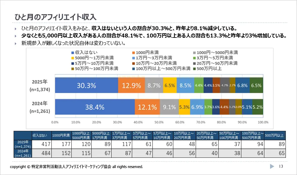 このデータはアフィリエイトマーケティング協会が毎年行っているアフィリエイト収益の調査結果ですが、1か月のアフィリエイト報酬が1,000 円未満の方は全体の43.2%います。