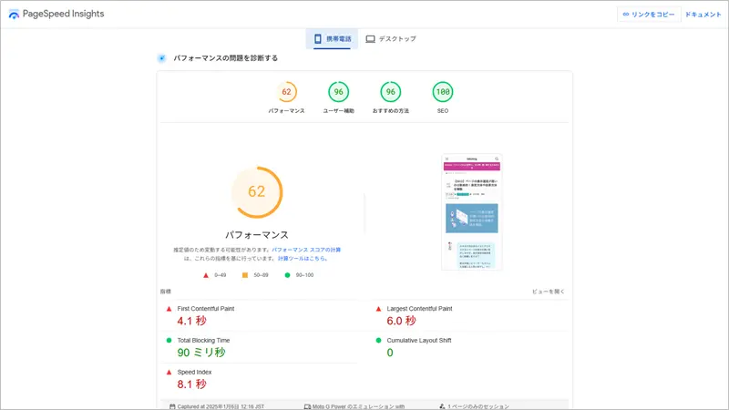 Googleページスピードインサイドを使って、このページの表示速度を測定したところ、結果は次のとおりでした。