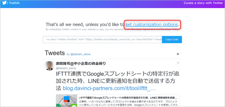 埋め込み用のHTMLコードとタイムラインのプレビューが表示された画面に移動します。